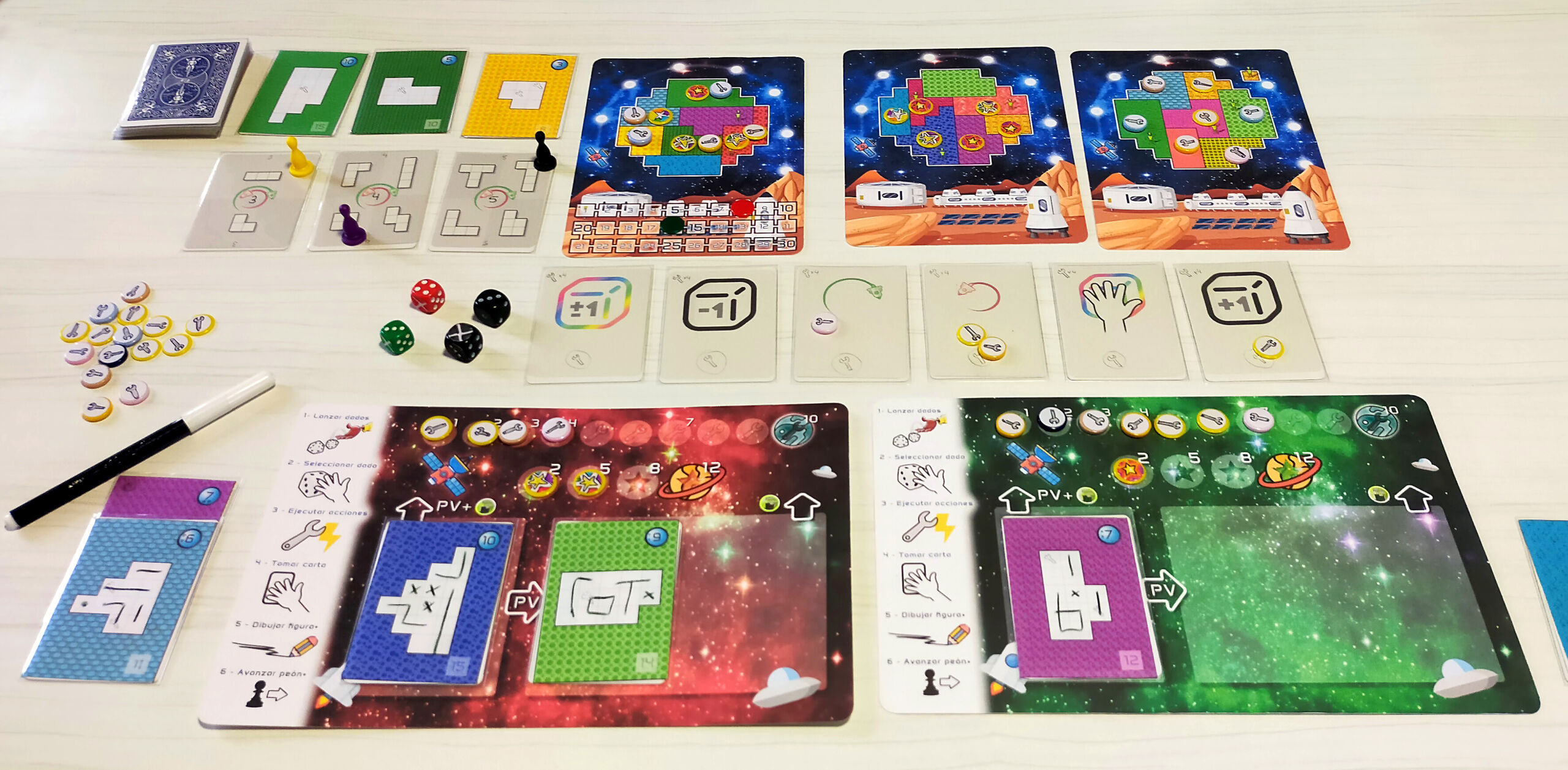 En Roll Planet nos embarcamos en una misión espacial, cuyo objetivo es explorar planetas para conseguir la mejor puntuación antes de que alguien concluya una de las expediciones, momento en el cual se detonará el fin de partida. En cada ronda se lanzarán los dados y cada participante elegirá uno, cuyo valor determinará el recorrido en forma de “pieza de tetris” que tendrá que dibujar en una de las cartas de exploración en su tablero personal.